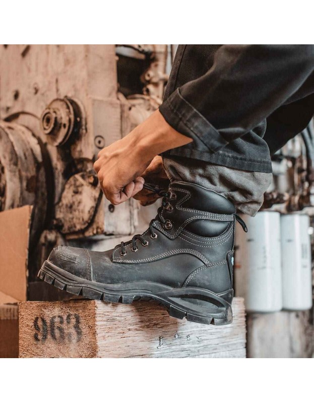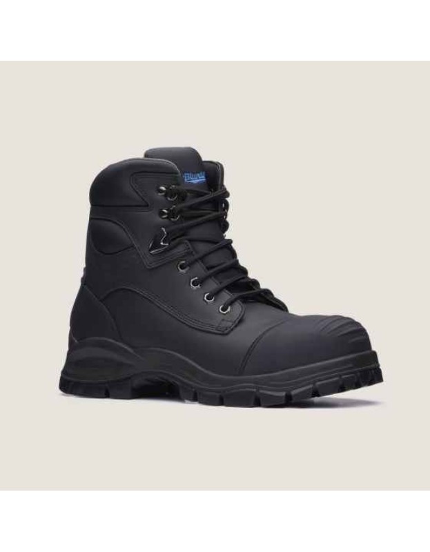 - Black premium quality water resistant leather, 150mm height, safety boot