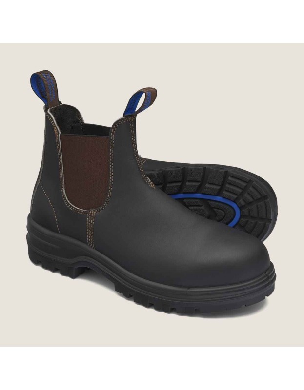 - Stout Brown premium water resistant leather upper, elastic side safety boot