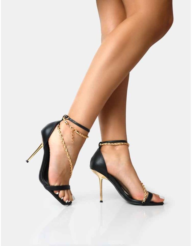 Loyal Black PU Chain Detail Square Toe Gold Stiletto Heels