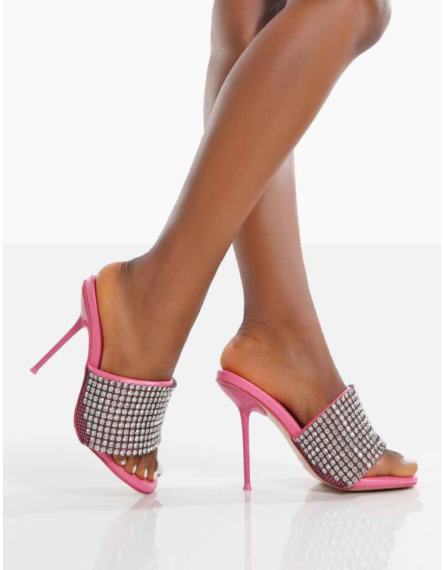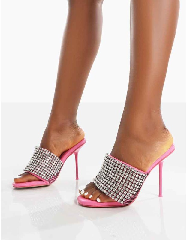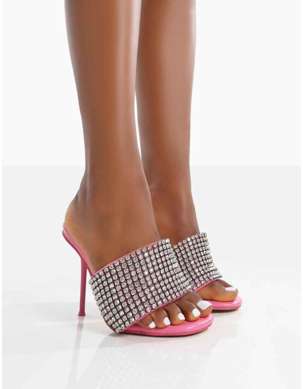 High Shine Pink PU Diamante Strappy Heeled Mules