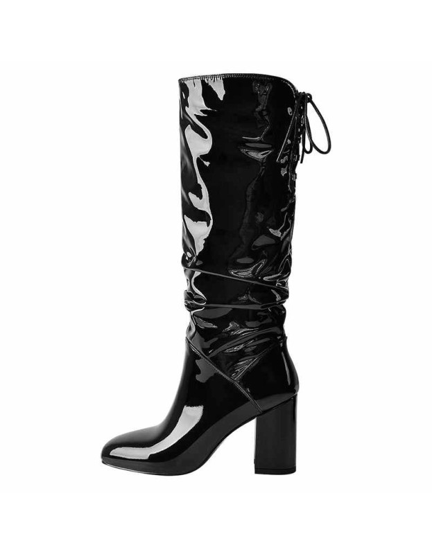 Black Patent Leather Chunky Heels Boots